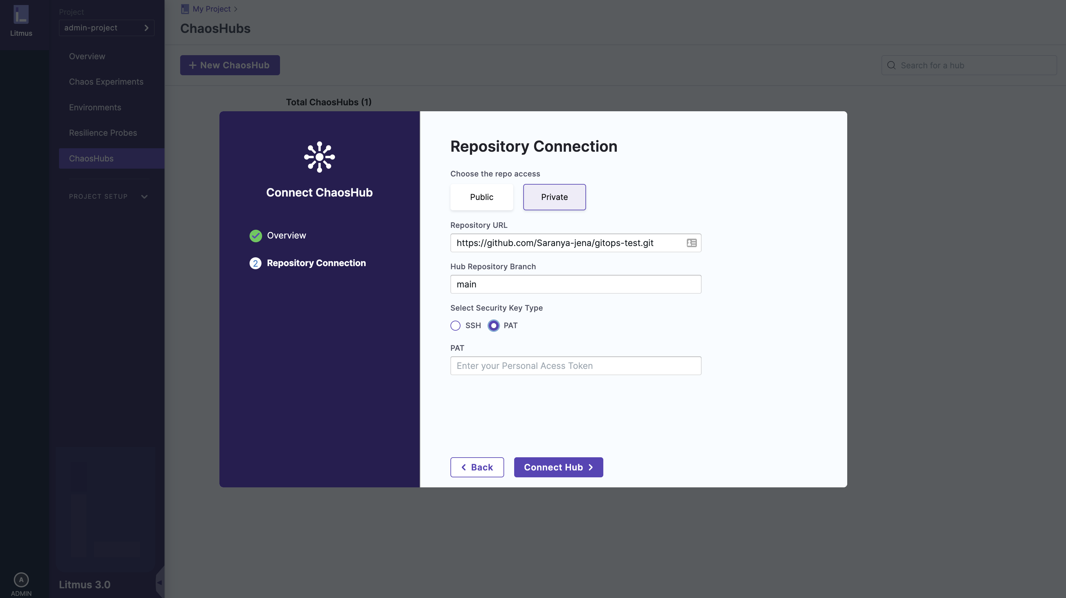 To add a private ChaosHub, you need provide the hub name, Git URL of the forked repository and the branch name similar to that of public hub and the repository can be connected in two ways: